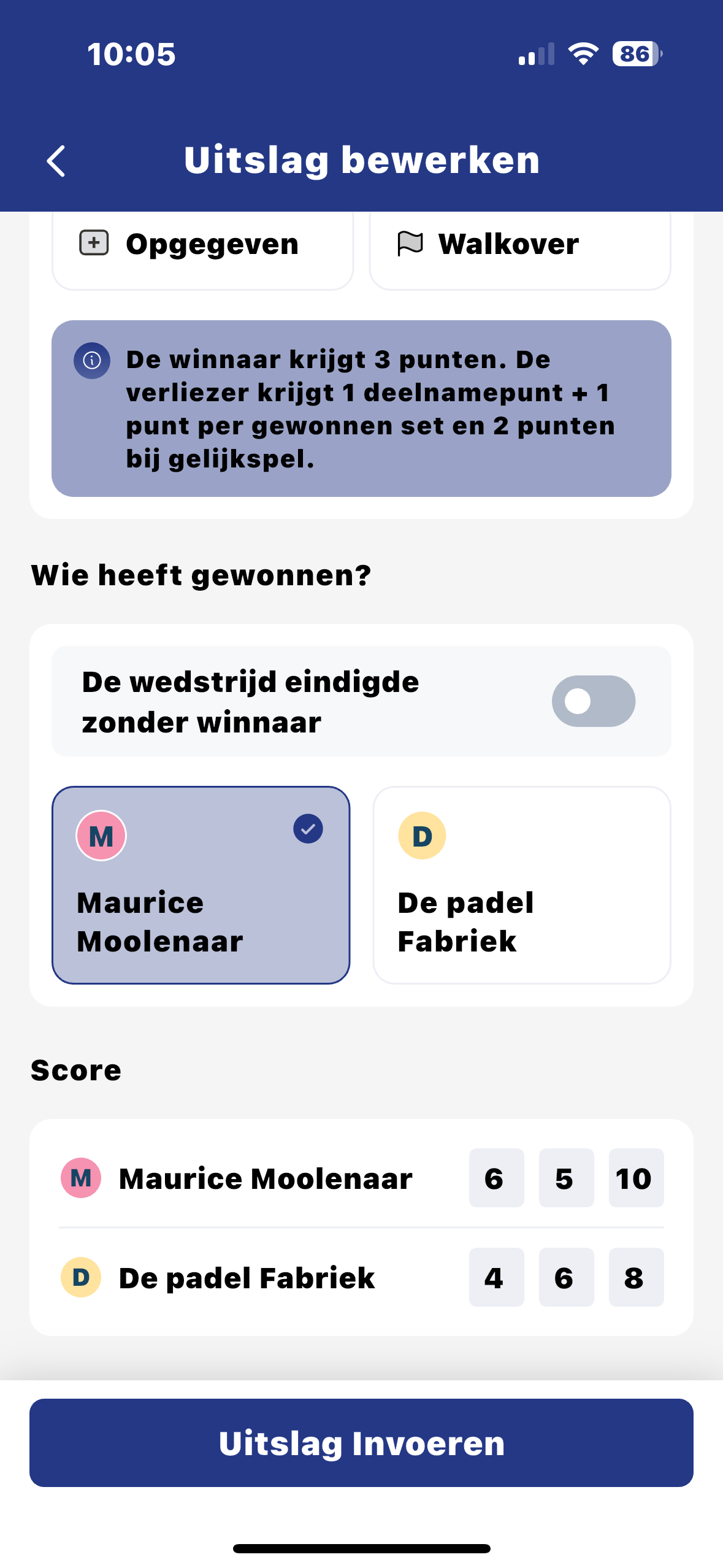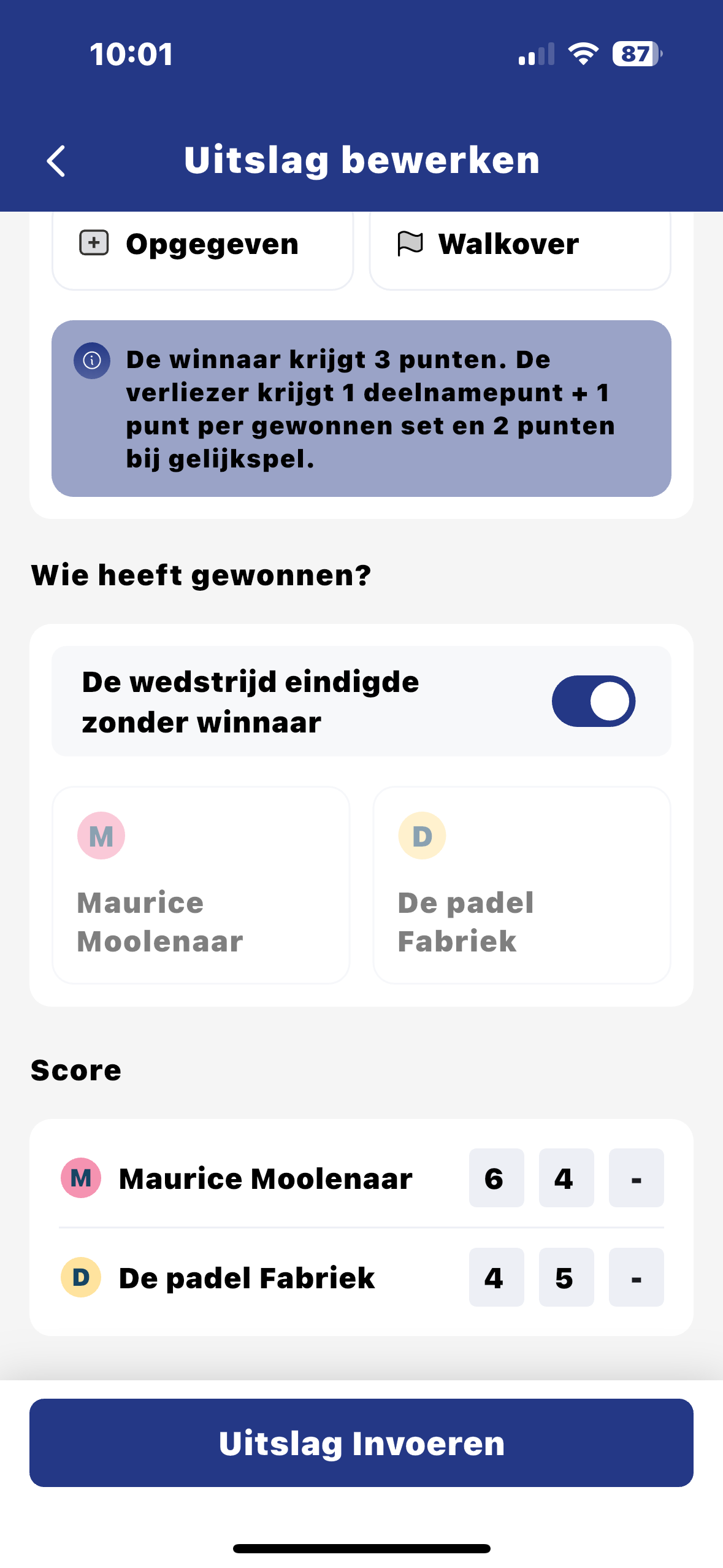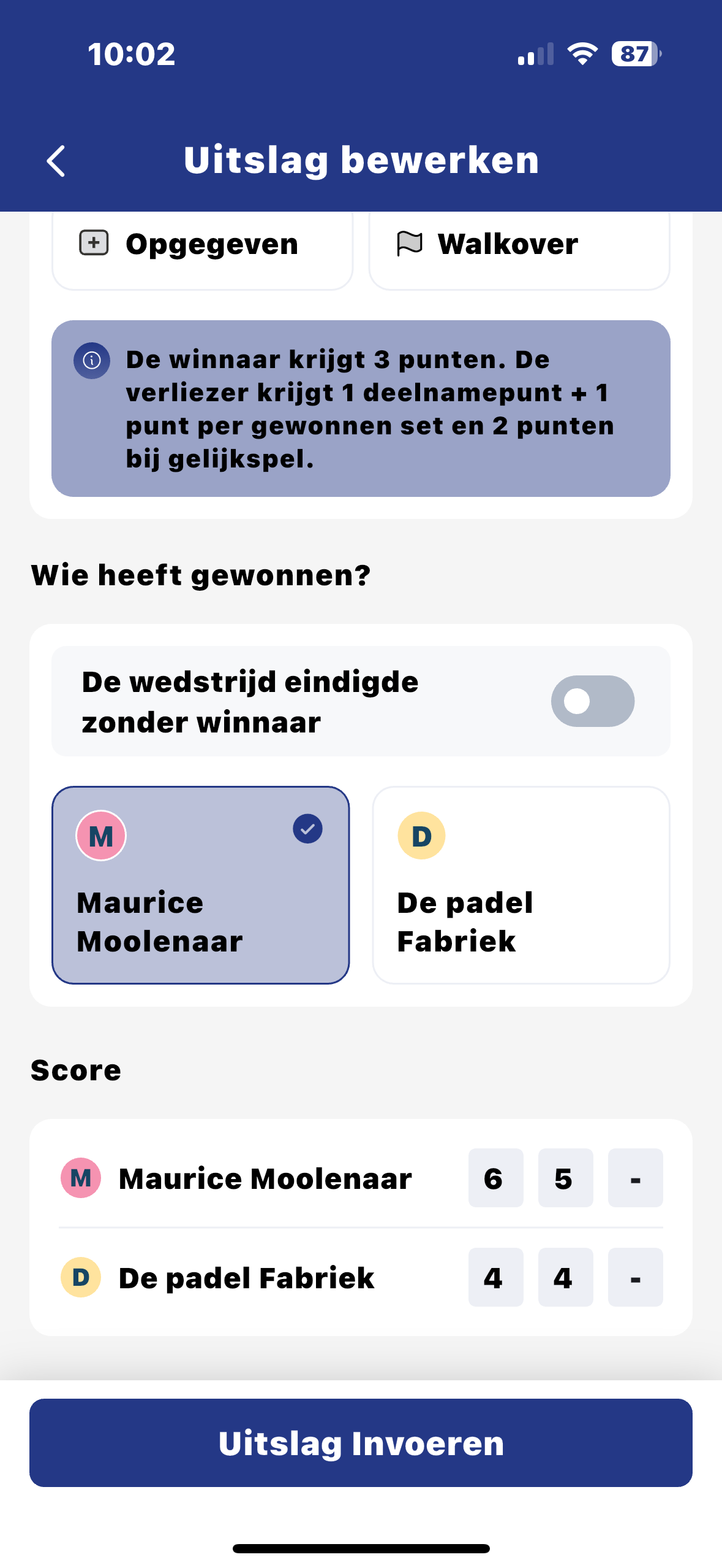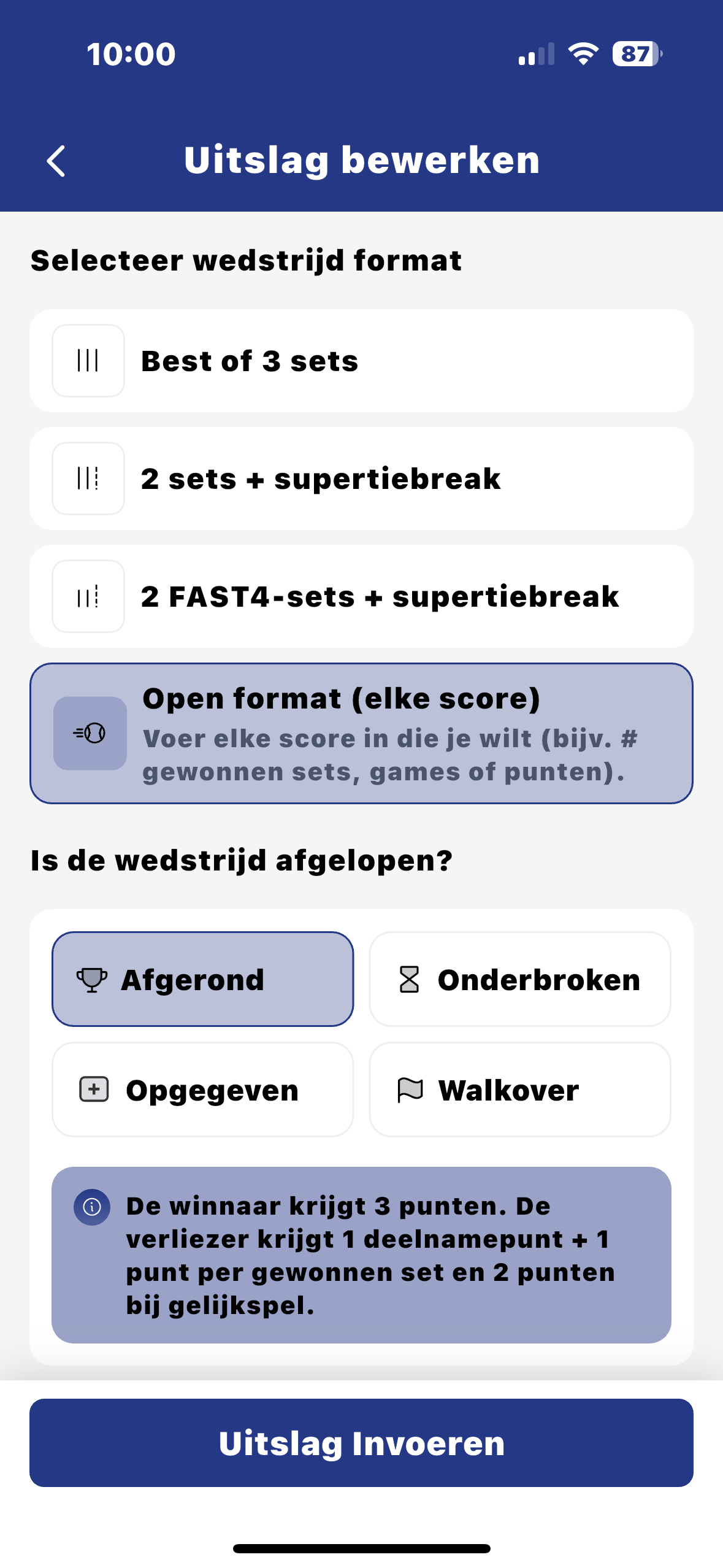 Druk op “Uitslag invoeren”. Hierna moet je een aantal stappen doorlopen.