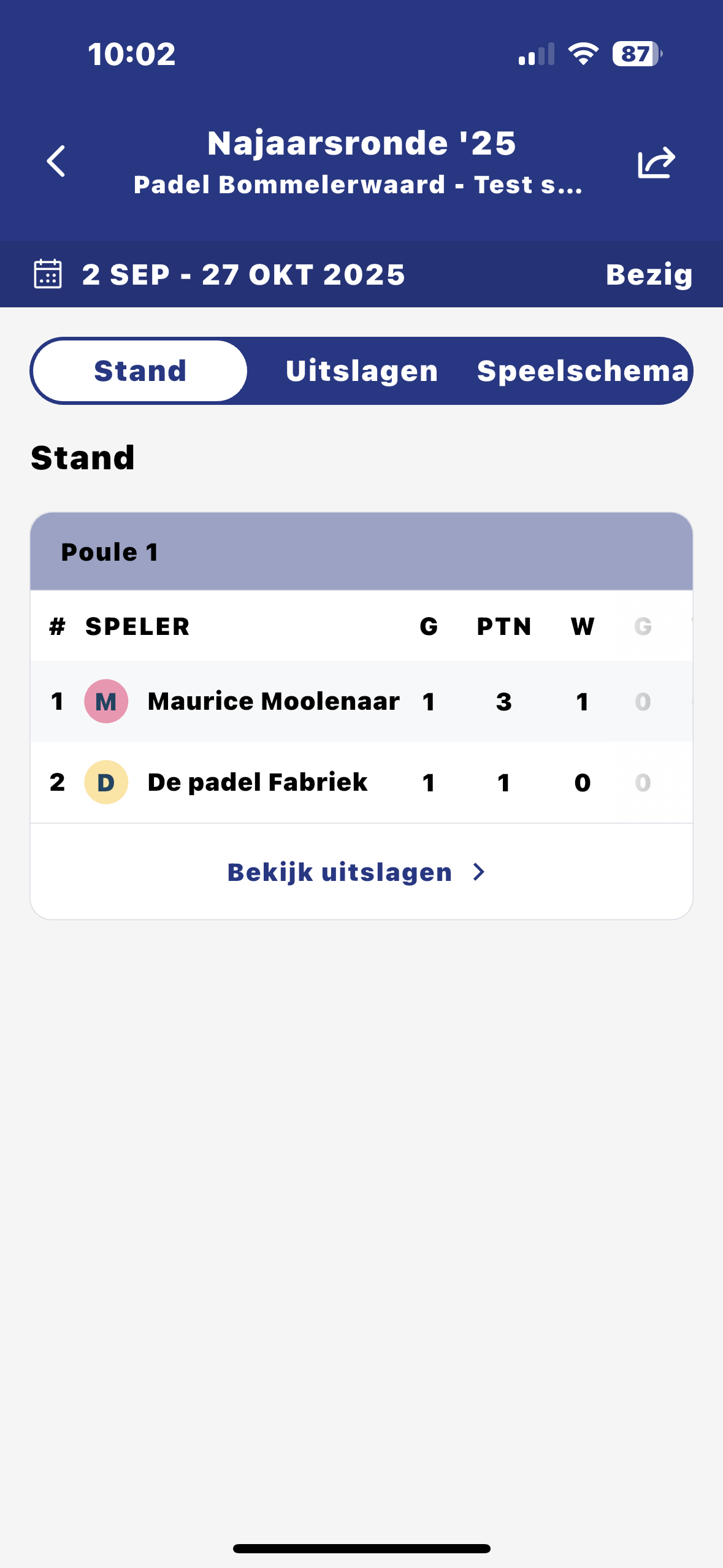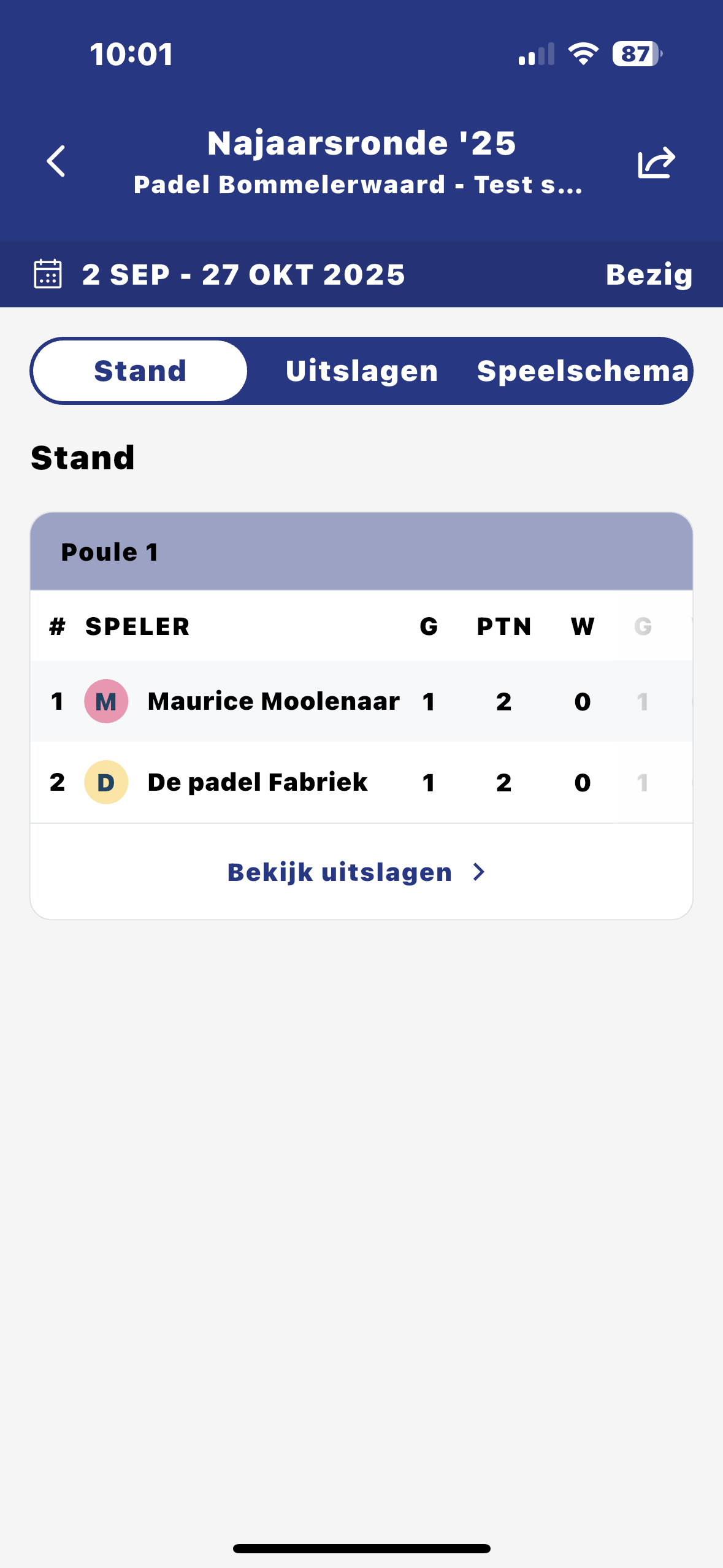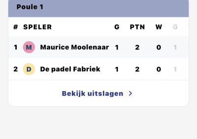 - Als je ’terug’ gaat dan zie je de uitslagen en de stand.