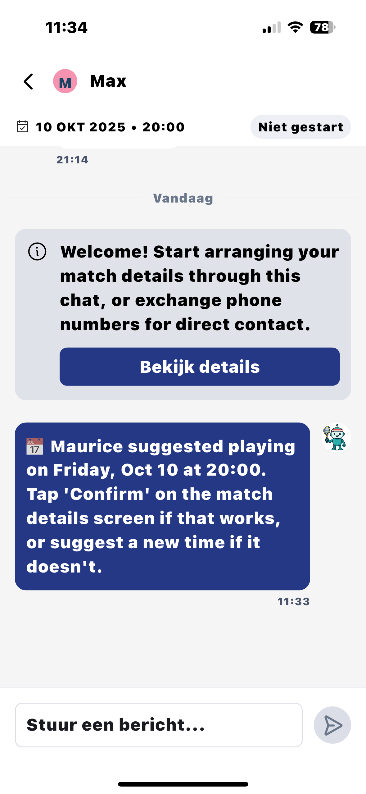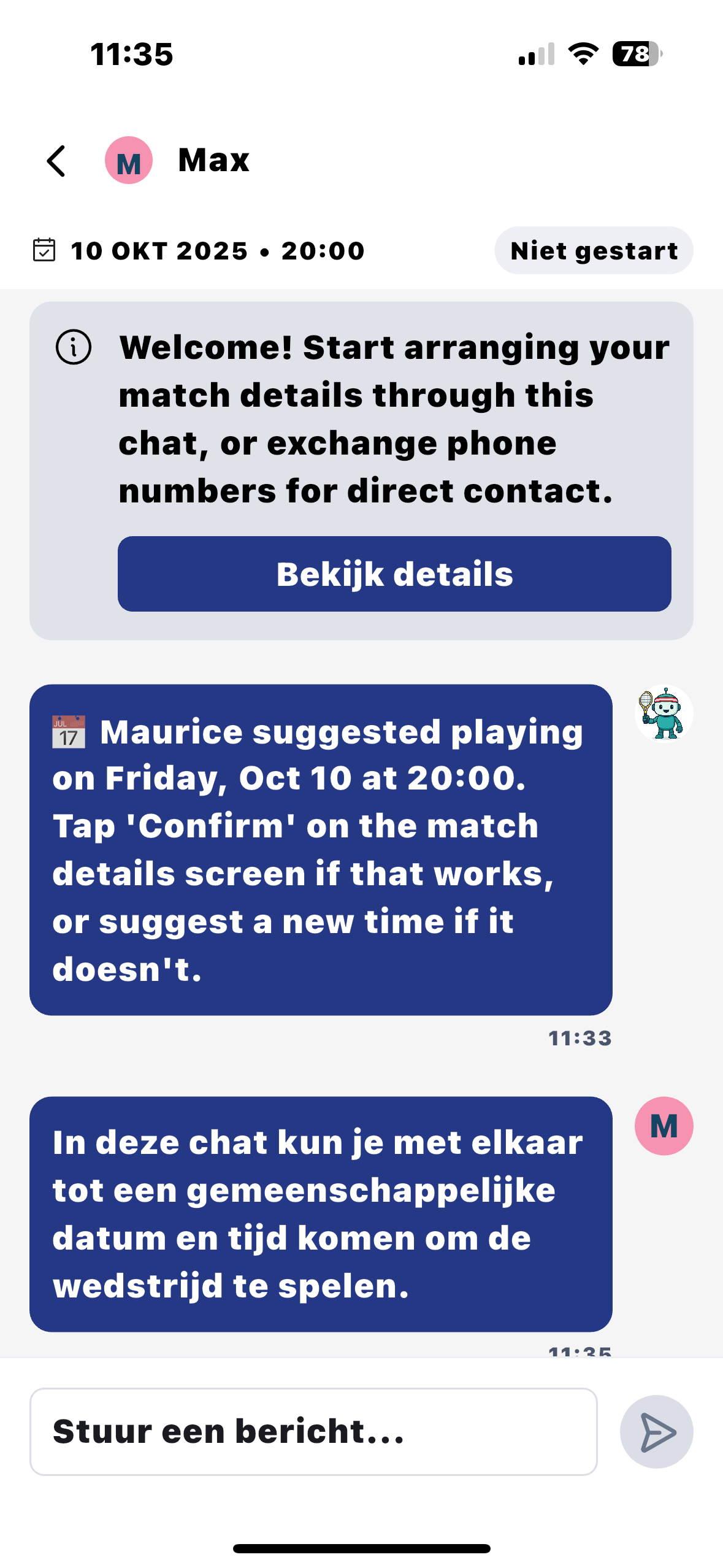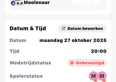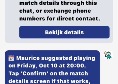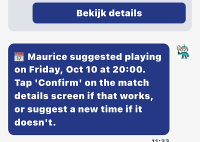De KNLTB Match app zal binnen je poule de wedstrijden onderling automatisch plannen en door daarbij een voorstel qua datum en tijd. We hebben het systeem de keuze gegeven dat hij iedere dag mag plannen tussen 8:00 en 23:00 uur. We gaan er vanuit dat jij contact opneemt met je tegenstander om een geschikt moment te vinden om de wedstrijd te spelen.